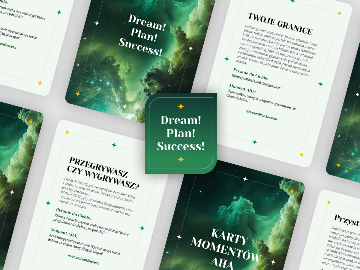 Praktyka z kartami Dream.Plan.Success to proces wsłuchiwania się w siebie, rozumienia emocji i myśli, które pojawiają się pod wpływem słów z karty. To szansa na odnalezienie drogowskazów, inspiracji, a nawet początku transformacji.